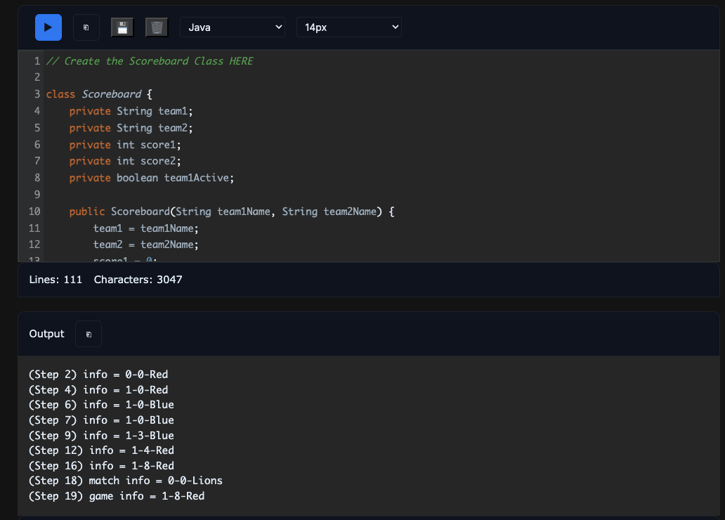 This project demonstrates how object-oriented design, clear method responsibilities, and simple control flow can be combined to model real-world rules accurately in code. Implementing the Scoreboard class reinforced the importance of managing state across method calls and separating logic that modifies data from logic that reports it. Overall, this problem helped solidify core AP CSA concepts while emphasizing clean, readable, and efficient program design.